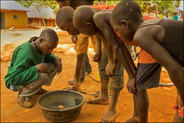 Africa. Uganda. Near Tororo. 2016. Fair Trade. Miners burn mercury off the gold amalgam in the open air close to their dwellings to produce a piece of gold which is sitting on top of the match box. It's being inspeced by the middle man (left) and mine workers.