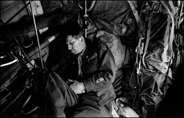 A US Army officer sleeps during a transatlantic flight on a transport plane. 1947.