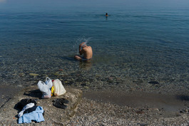 GREECE. Lesbos. 2016. Refugees enjoy the warm Aegean Sea before winter.