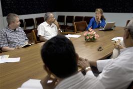 INDIA. Madurai. 2005. Aravind Eye Hospital, eyecare for the poor through a telemedicine network that connects four private eye hospitals in southern India, increasing their capacity to conduct remote consultations for poor patients with eye disease in rural areas. Of the nine million blind people in India, 85% suffer from preventable blindness. Jaqcueline NOVOGRATZ and Acumen Fund Board in discussion with Aravind hospital directors.