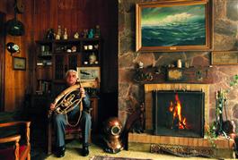 Chile, Patagonia, Punta Arenas. Francisco Ayarza Ordenes, owner of "Nautilus" diving operation in his home with a tuba, which he has recovered from the sunken German warship "Dresden".
