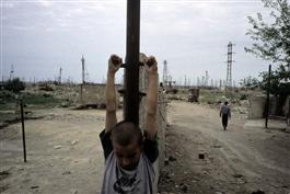 On the mainland of Baku. War refugees in and around apartment complex on edge of fields.