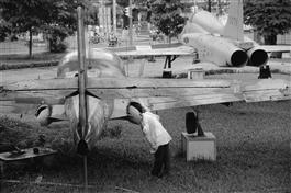 VIETNAM. Ho Chi Minh City. On the grounds of the old Presidential Palace an ever inquisitive Vietnamese inspects the military planes on display there.