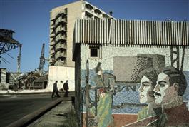 The man made island of Neft Baslani (Oily Rocks). Mosaic glorifying oil industry.