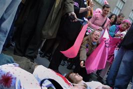 USA. New York City. March 27, 2003. Anti-war demonstrators stage a "die-in" outside of Rockefeller Center to symbolize Iraqi war victims.