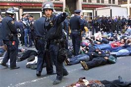 USA. New York City. March 27, 2003. Anti-war demonstrators stage a "die-in" outside of Rockefeller Center to symbolize Iraqi war victims.