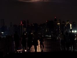USA. New Jersey. August 14, 2003. Residents look across the Hudson River to the Midtown Manhattan skyline during the Blackout of 2003.