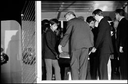 USA. La Guardia Airport, New York City. June 6, 1968. The coffin of Robert Kennedy is removed from the plane that brought his body to New York from Los Angeles, where he was assassinated on June 4. Robert KENNEDY, Jr. is seen at left and Senator Edward KENNEDY is seen third from left.
