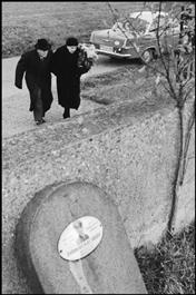 WEST GERMANY. Tegernsee. 1965. Couple visit a cemetery behind a gravestone with a photo from World War II.