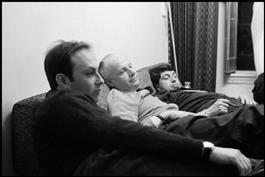 USA. New York City. 1962. Magnum photographers Bruce DAVIDSON, Henri CARTIER-BRESSON, and Dennis STOCK at the Chelsea Hotel.