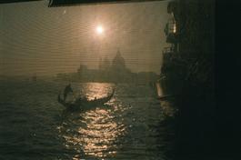 ITALY. Venice. 2002. View from St. Mark's Square looking toward Santa Maria della Salute, seen through a plastic window at a vaporetto stop.