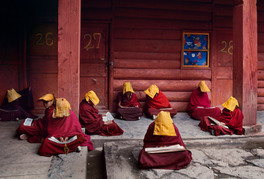 Tibet. Kham. Litang. 1999. Young monks study Buddhist scripture at a monastery.