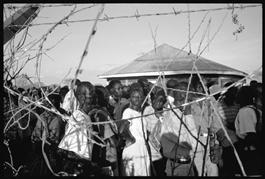 KENYA. Kakuma Refugee Camp. August 2001. People in the camp come to see the "Lost Boys" as they leave for their journey to the United States.