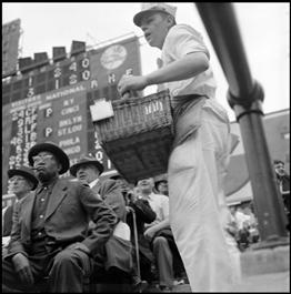 USA. New York City. 1949. Vendor and crowd in the right field stands of Yankee Stadium.