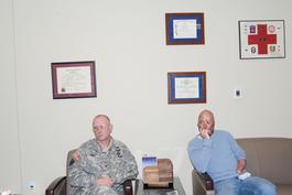 USA. San Antonio, TX. 2014. Bobby Henline with surgeon Dr. Evan Renz at the San Antonio Military Medical Center. Dr. Renz has helped treat many of the badly wounded veterans who have passed through the hospital in the past thirteen years.