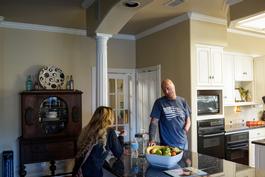 USA. San Antonio, TX. 2014. Bobby Henline talks to his Norwegian high school exchange student.