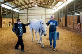USA. San Antonio, TX. 2014. Bobby Henline takes part in horse therapy for injured veterans. Soldiers and Marines recovering at the San Antonio Military Medical Center are offered free horse lessons as a means of lifting spirits and soothing troubled emotions.