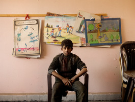 SYRIA. Aleppo. 2013. A young boy working as a bombmaker for the rebels, inside a school that is now a bomb factory.