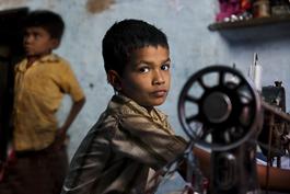 INDIA. April, 2012. Young boy operating a sewing machine.