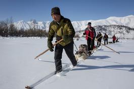 CHINA. 2013. Altai Mountains, Xinjiang. Tursin and his friends out on a multi-day trip out of Akorum village, where they carry all their own supplies. Temperatures in the area regularly drop to minus 40 Celcius. Skiers in the area use a single wooden staff, as opposed to the modern two-pole technique, and the base of their handcrafted skis have horse-hides permanently attached for traction. In the far northern corner of Xinjiang province, in the Altai mountains, one can find the last remnants of an ancient culture. The area is populated by a mix of ethnic Kazakhs, Mongolians and Tuwas, who handmake their own wooden skis in the same way as their forefathers thousands of years ago.