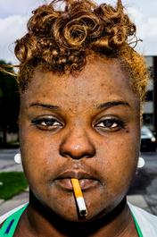USA. Milwaukee, Wisconsin. 2013. Karyn at a bus stop.