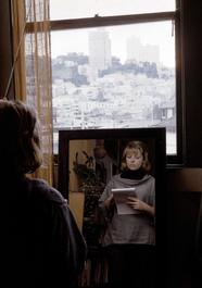 USA. San Francisco. 1960. Nemi Frost does self portrait sketch in mirror in front of window in her Harwood alley pad.