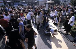 USA. New York City. September 12, 2001. Crowd gathers at memorial in Union Square.
