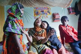 BANGLADESH. Savar slum District, Dhaka. 2015. Tara, cousin of Surruz (age 21). No last name given, missing victim of Rana Plaza garment factory collapse, mourns for her cousin as her daughter Kakoly (age 10) attempt to console her.