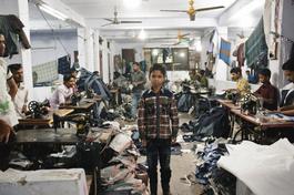 BANGLADESH. Keraniganj, Dhaka District. 2015. Garment workers. Keranigani, on the Buriganga River at the south end of Dhaka, is one of the largest ports in the world. This section of the district houses hundreds of small local sweat shops where laborers are paid by piece. Most work a minimum of twelve hour days, six days a week. Since windows are barred in the seven story buildings, they remain uninspected fire hazards. Child labor laws are not enforced. Clothing here is made for local distribution.