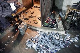 BANGLADESH. Keraniganj, Dhaka District. 2015. Garment workers. Keranigani, on the Buriganga River at the south end of Dhaka, is one of the largest ports in the world. This district houses hundreds of small sweatshops where laborers are paid by piece work sewing twelve hours a day, six days a week. The buildings remain uninspected with fire hazards. Child labor laws are not enforced. Clothing here is made for local distribution.