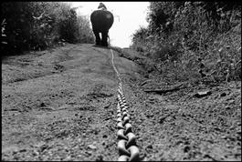 THAILAND. Lampang. 1997. After the daily treatment at an adult elephant hospital, an elephant is set loose to wander as far as her chain will allow.