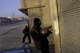 IRAQ. Out camp Sykes, Between Mosul and the Syrian Border, Town of Talofar. January 16, 2005. Task Force 1-14. Joint foot patrol with the local ING (Iraqi National Guard) and Iraqi Police. Encouraging locals to vote. The patrol gets pinned down in a 2 hour firefight with insurgents.