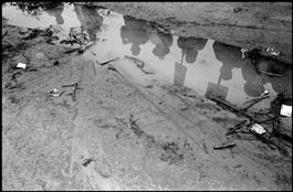 USA. California. Imperial Valley. 1968. Reflection in a rain puddle of United Farm Workers picketing on the outer edge of a farm. The purpose was to organize the laborers to join the union.