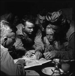SOUTH PACIFIC. Between October 26th, 1943 and December 9th, 1943 on board the US aircraft carrier USS Saratoga. Torpedo bomber pilots being debriefed by intelligence officer.