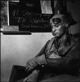 SOUTH PACIFIC. November, 1943 on board the US aircraft carrier USS Saratoga. Pilot in ready room preparing for mission.
