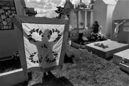 EL SALVADOR. San Salvador. 1992. Woman with blanket in the General Cemetery on All Saint's Day, the day families remember their dead and picnic on the graves of deceased relatives. El Salvador is a Roman Catholic country, the only country in the world to be named after the Christian Savior with its villages and towns named after the saints. (El Salvador, page 48-49) ©Larry Towell/Magnum Photos