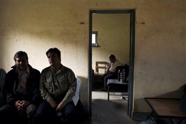 NEPAL. Kathmandu. 2006. On the 25th of April, the day after King Gyanendra's statement reinstating the lower house of parliament, detained men await news of their fate at an armed police forces training base. Detainees from the protests are often held in military or police barracks instead of normal prisons.