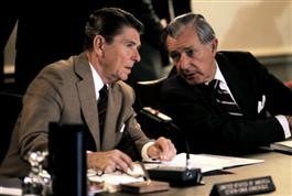 USA. Williamsburg, Virginia. 1983. President Ronald REAGAN and Secretary of the Treasury Donald REGAN confer during a plenary session of the 1983 Industrialized Nations Conference.