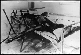 CAMBODIA. Phnom Penh. 1998. A photo of a torture victim on a bed at the Khmer Rouge Torture Center at Tuol Sleng. The Khemer Rouge documented every step of the torture process, including before and after pictures.