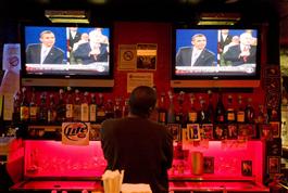 USA. Youngstown, Ohio. October 7th, 2008. Watching the 2nd Obama/McCain presidential debate at Club Deja Vu, which serves as a local community meetplace.