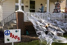 USA. Liberty, Ohio. October 7th, 2008. A Barak OBAMA supporter's home decorated for Halloween.