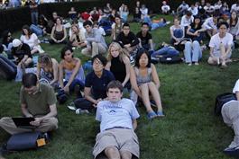 USA. New York City. September 2007. Crowd listening to Iranian President Mahmoud Ahmadinejad speak at Colombia University.