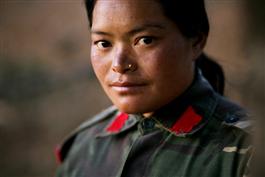 NEPAL. Rolpa District. 2007. Cantonment camp for Maoist guerillas at the village of Dahaban in the district of Rolpa. Portrait of Comrade Kalpana, a 22-year old Maoist platoon commander (real name Tej Maya Rokka). Along with the rest of the 5th division, she is interned at the cantonment camp. She has been in the Maoist movement for over five years, and is a veteran of many of the biggest battles in the war. According to the peace agreement, the Maoist fighting forces are to be interned in camps across Nepal until their future is decided upon. The Dahaban camp is for the Maoist 5th Division, and contains about 2000 soldiers.
