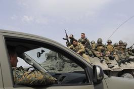 GEORGIA. near Gori. August 14, 2008. Georgian soldiers in car...