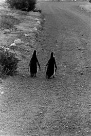 ARGENTINA. Patagonia. 2001. A pair of Magellan penguins walk down the road together at Punta Tombo Beach.