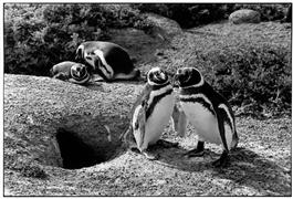 ARGENTINA. Patagonia. 2001. A pair of Magellan penguins stand outside their nest on Punta Tombo Beach.