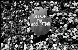 ISRAEL. Jerusalem. October 2003. A Women in Black sign on flowers at Paris Square reads "Stop the Occupation." Women in Black is an international movement of mothers and wives who protest war. The Jewish-Israeli women are opposed to the occupation, the construction of Israeli settlements on Palestinian land and the construction of the new separation wall.