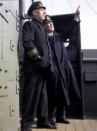 ATLANTIC OCEAN. 1941. The captain of a Cunard freight ship carrying seven airplanes, two torpedo boats, and twelve passengers speaks with one of his crew. His ship is part of an Allied convoy en route to Great Britain from the U.S. He and his crew are Norwegian and have crossed the Altantic many times during the war.
