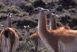CHILE. Magellan Straits. Tierra del Fuego, wild Guanacos grazing...