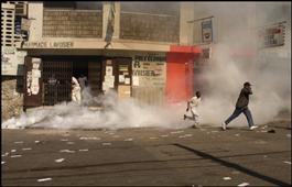 HAITI. Port-au-Prince. December 2003. Anti-Aristide demonstration. Police shoot teargas over a crowd to disperse demonstrators.